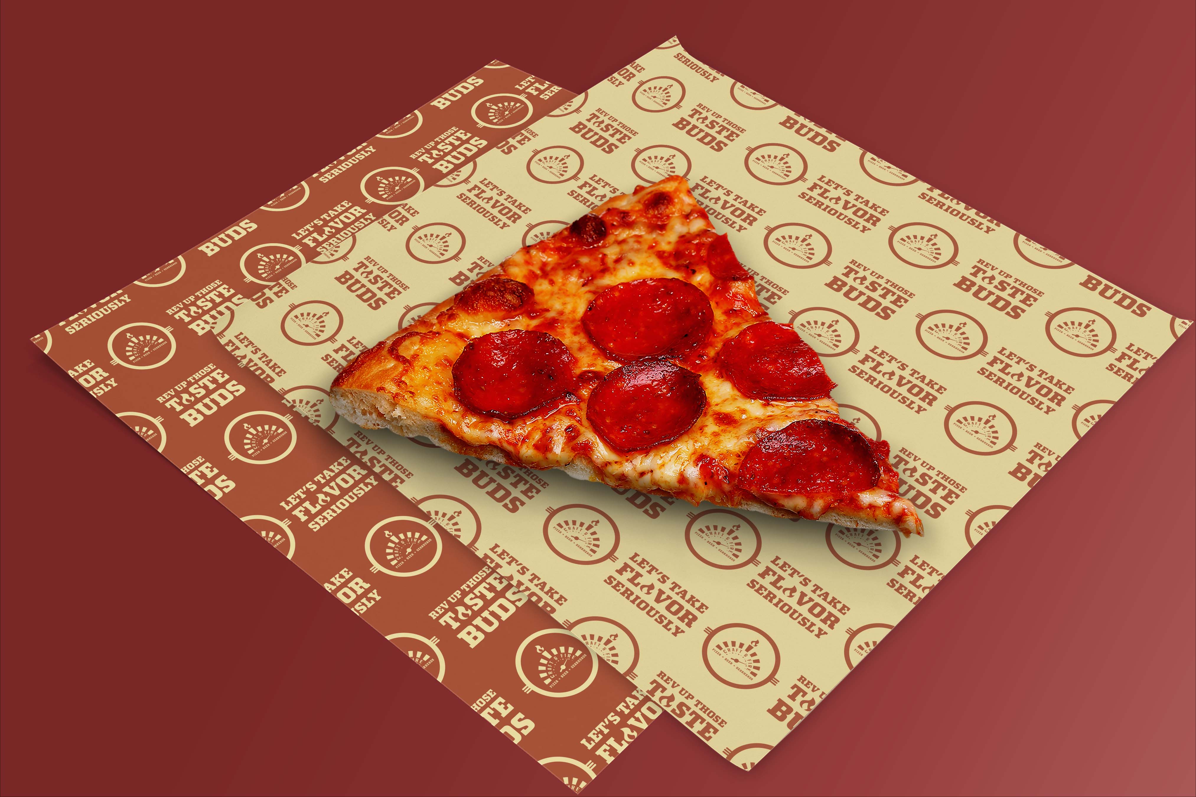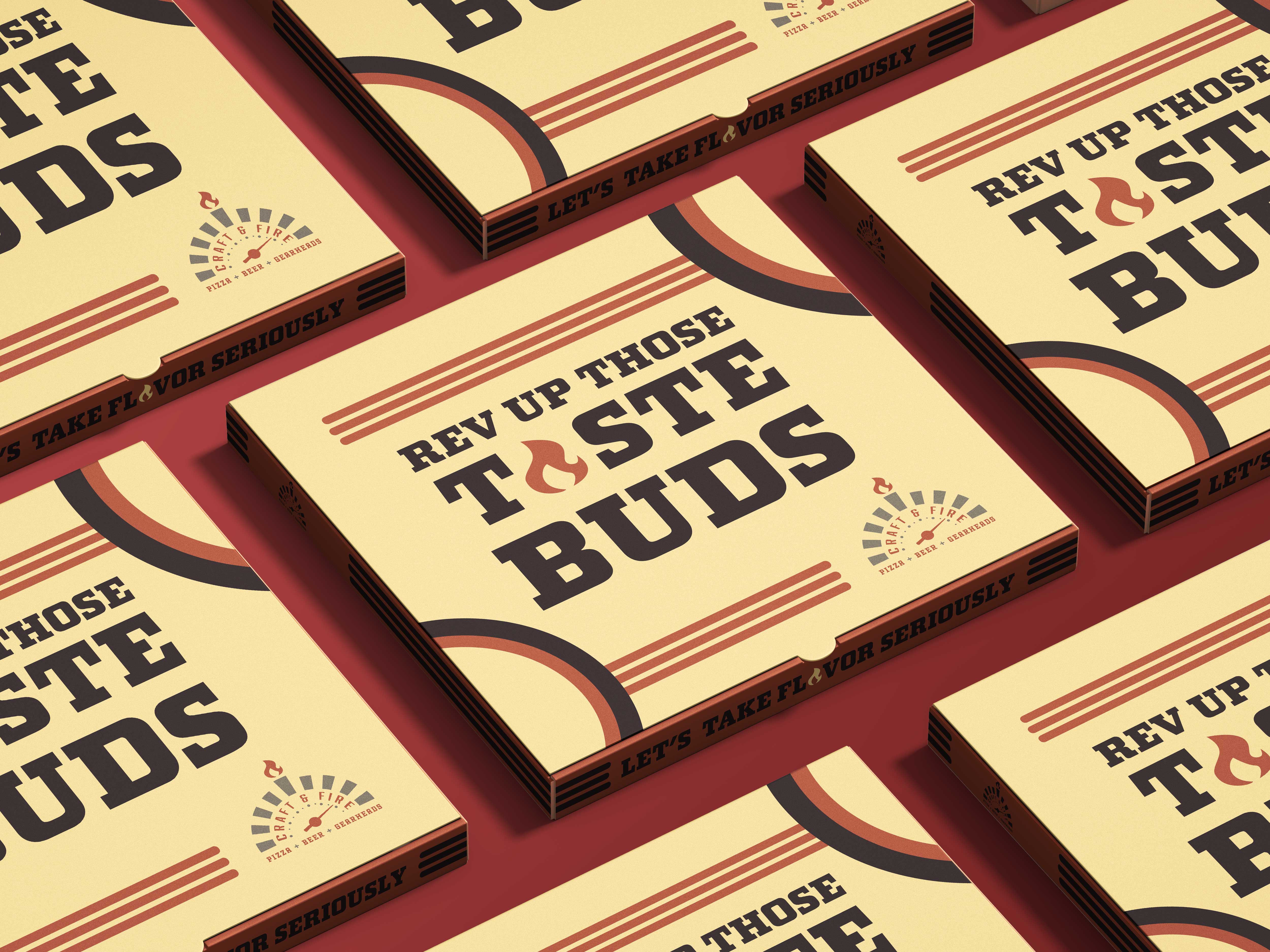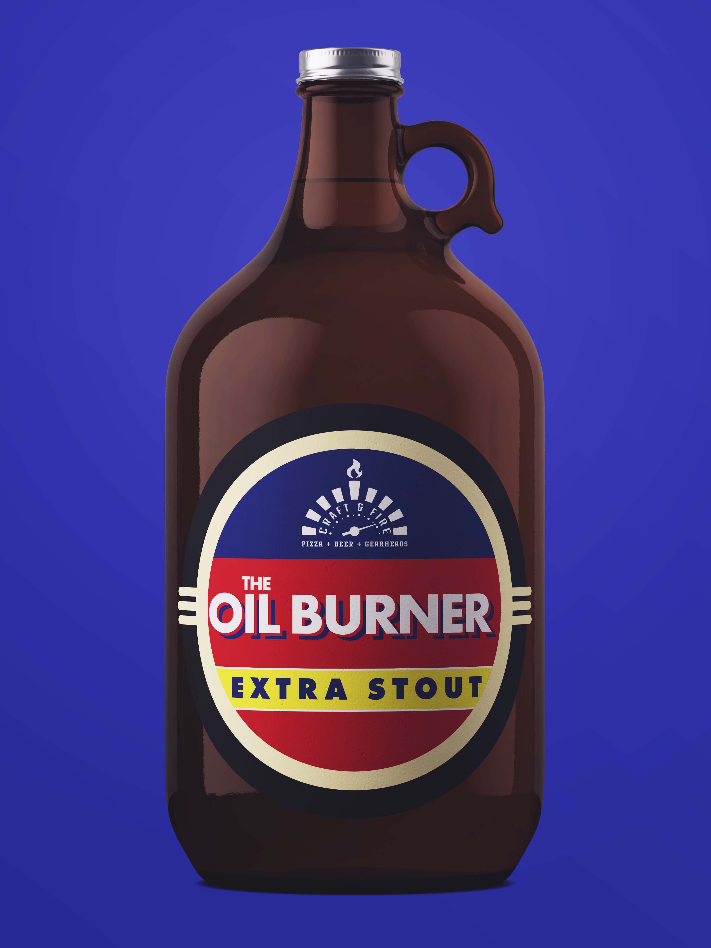Class assignment of promotional design for a fictitious client, a pizza parlor housed in an old car repair shop. The digital promotional materials included four amber growlers, wax paper, a mechanic-style t-shirt for the staff, an individual pizza box, and plastic paper cups.