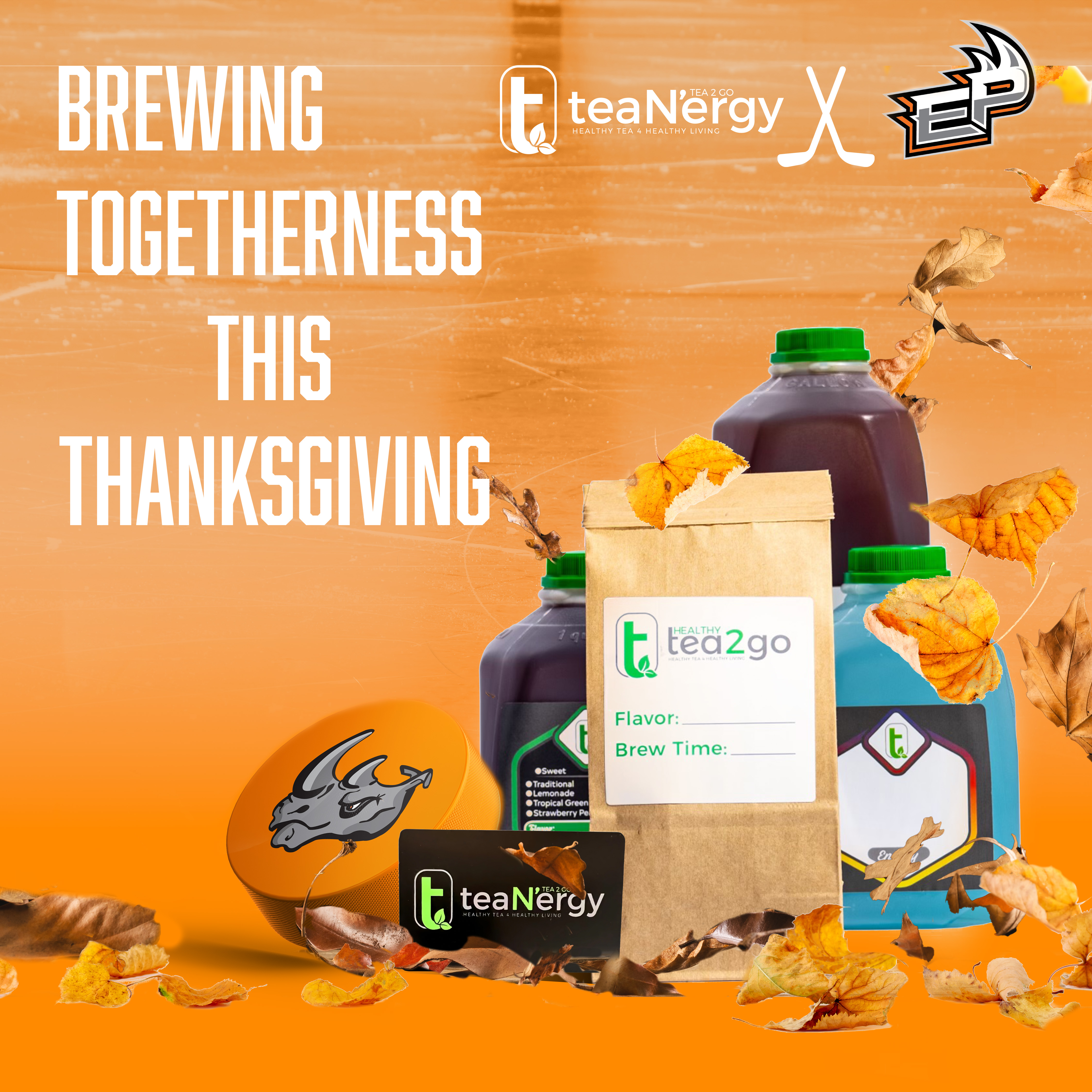 Promotional material for tea2go - teaN'ergy in collaboration with the El Paso Rhinos hockey team for the 2024 Holidays season. The first graphic was made for Novembers newsletter to honor Thanksgiving while the second was made for the December newsletter for the Holidays. CREDIT: Logos owned by tea2go and the El Paso Rhinos respectively.